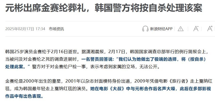 在2月17日韩国警方举行的例行检会上,一名警员把这起案件视为自杀处理。