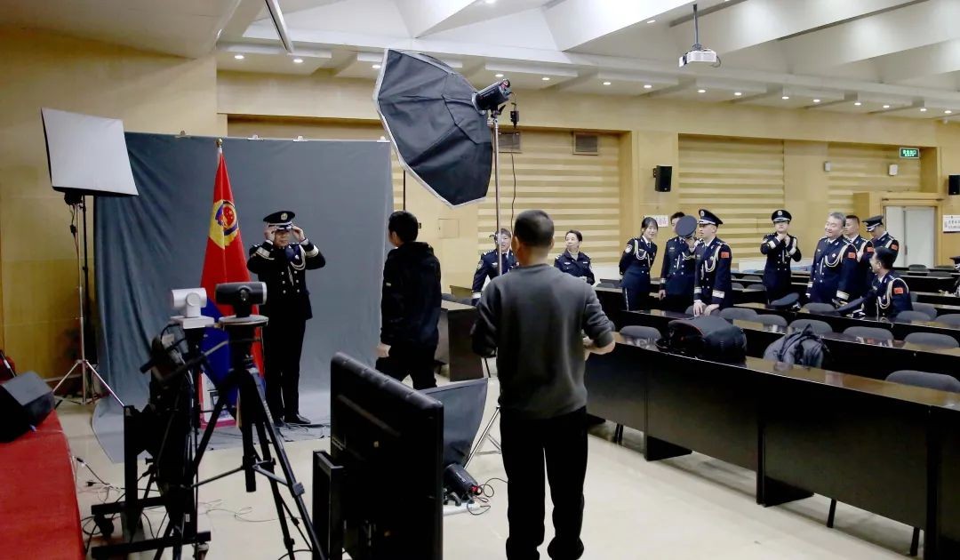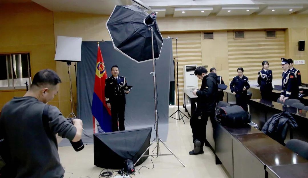为了使民警在拍摄时展示处最佳状态,分局专门邀请专业摄影团队现场指导民警的体态、服装和状态,伴随着快门按动的声音,民警警容严整、精神抖擞,发自肺腑的自豪和喜悦被摄影师的镜头定格下来,记录下了终身难忘的一刻。