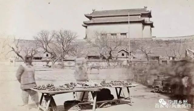 1870年,北京德胜门箭楼南面,瓮城内部,两个卖土豆的小贩在吆喝着,他们身后不远处是真武庙。