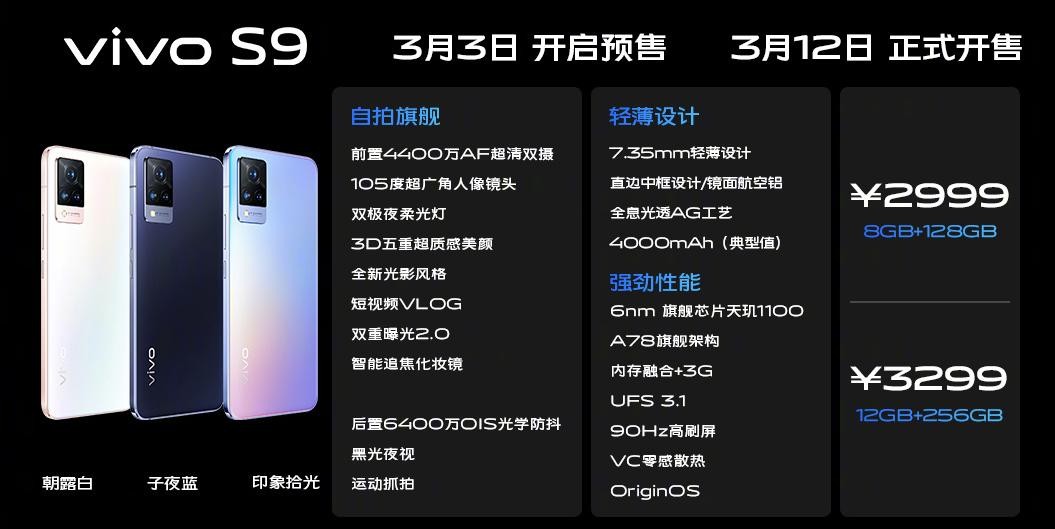 在这张图的结尾我们可以看到,现阶段vivo S9已经开启的预售通道,并且将会在3月12日正式开售。而除了上文中所提到的几点以外,像全新的3D五重超质感美颜、OriginOS系统与超薄VC均热板等特点,同样获得了各大权威媒体的交口称赞。如果大家也对该机感兴趣的话,不妨将视角移步到vivo官方网站进行进一步了解。相信届时,大家定能从中发现更多的惊喜。