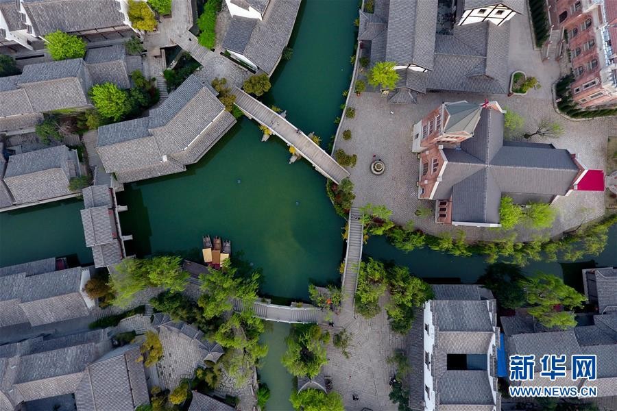 4月7日航拍的台儿庄古城。山东省枣庄市台儿庄古城位于京杭大运河沿岸,是明清时期有名的“水旱码头、商贸重镇”,一度“商贾迤逦,一河渔火,歌声十里,夜不罢市”,但是于1938年毁于日军炮火。
