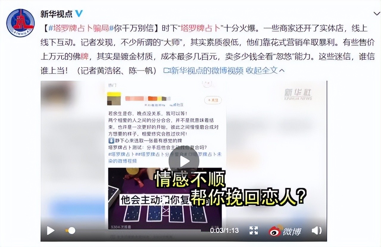 近期,有非常多的新闻报道,很多小伙伴通过所谓的“塔罗师”询问桃花、事业问题,做各种各样的挽回仪式,最后被骗几十w的案例。