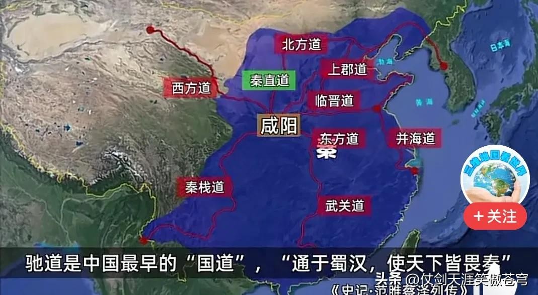 秦始皇以咸阳为中心,不仅修建了秦直道,还修建了众多的驰道,也就是现在的“国道”