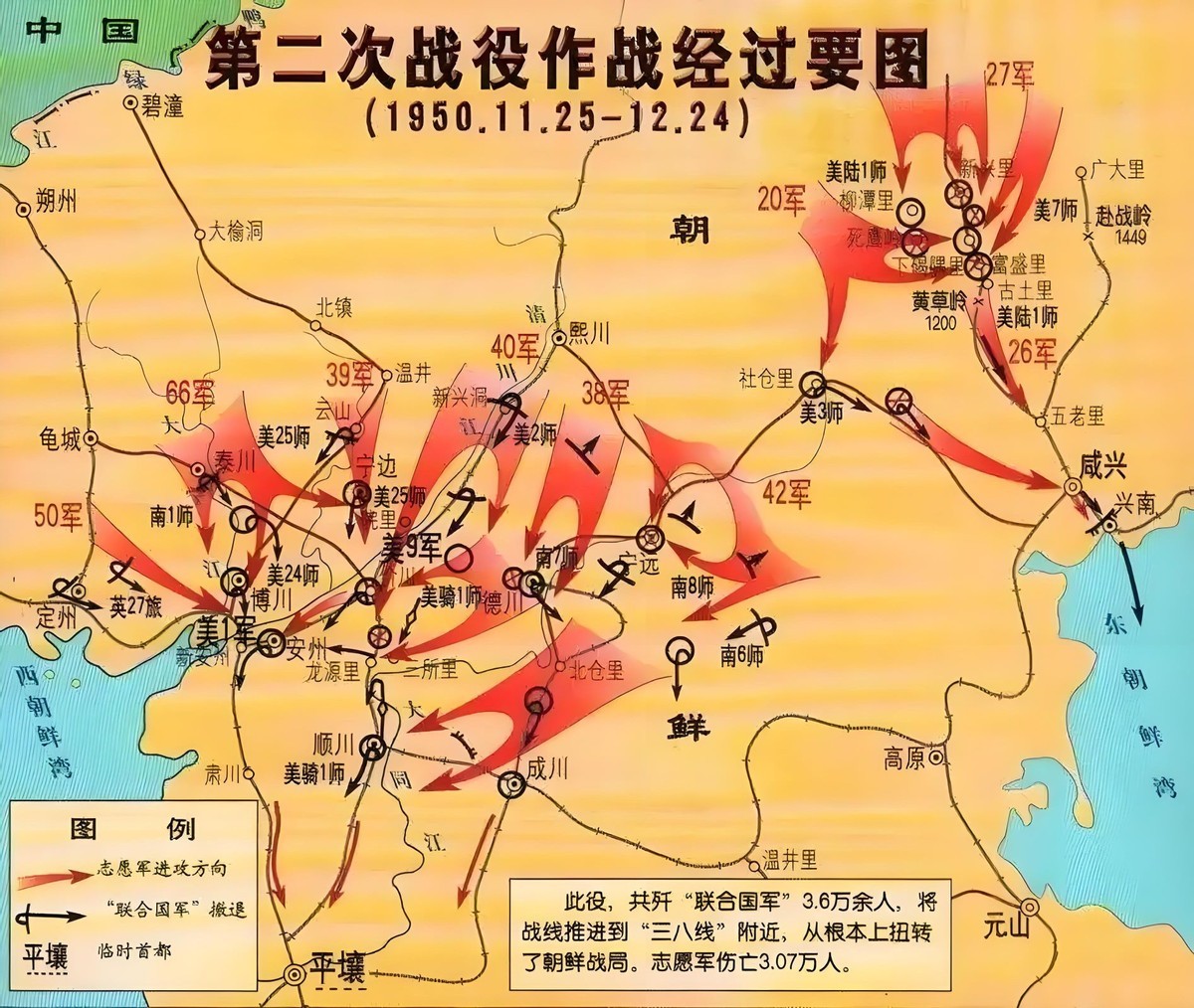 11月24日,美军发动总攻,结果是东线长津湖和西线的博川、三所里一线全都遭到败绩,我军一路横推,将联合国军赶到了三八线以南。