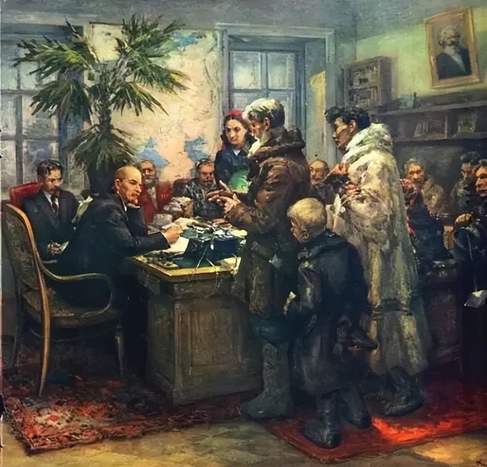 1917年11月8日,大会通过了列宁起草的《和平法令》和《土地法令》。《和平法令》揭露了帝国主义掠夺性战争,反映了广大劳动人民迫切希望和平的愿望,建议一切交战国立即进行谈判,缔结不割地不赔款的和约。《土地法令》法令规定立即废除地主土地所有制,全部土地收归国有,交给劳动农民使用。最后,代表大会选举成立了世界上第一个工农兵苏维埃政府──人民委员会,无产阶级伟大导师列宁当选为人民委员会主席。人民委员会下设各部,执行无产阶级国家的各种职能。斯大林当选为民族事务人民委员,托洛茨基当选为外交人民委员。