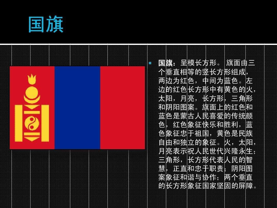 蒙古国先后采用过8面国旗。蒙古国国旗旗面上的红色和蓝色是蒙古人民喜爱的传统颜色。