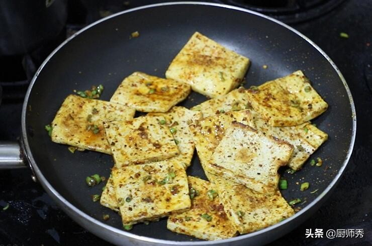 3、豆腐煎制金黄之后再翻过来煎制另外一面,也要适当的淋油进去,豆腐两面完全金黄之后下入辣椒粉(根据自己喜好,灵活增减),孜然粉,翻炒均匀之后再下入大葱花。