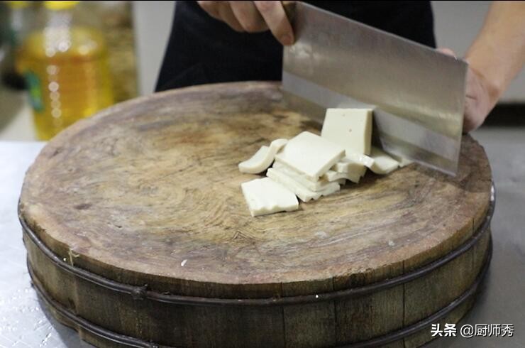 1、下面先把原料改刀,大葱切成葱花,千叶豆腐先切成长方条,然后再切成厚片,千叶豆腐片薄厚要均匀,切好的豆腐放在碗内备用。