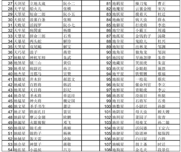 水浒传梁山好汉一百单八将名单座次,绰号与结局