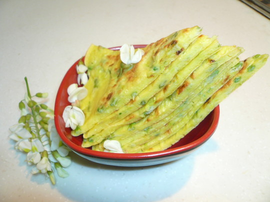将槐花洗净沥干,倒入水、面粉、蛋液、食盐、五香粉等调味,充分搅拌,使其成为糊状;