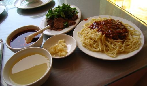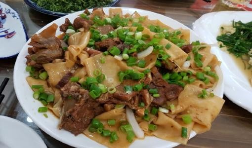 拉条子不仅是新疆的特色,也是西北各省人民喜爱的美食,是敦煌当地的家常饭。拉条子的制作过程稍复杂,面条是用手拉制而成,煮熟后捞在大盘子里,加入炒熟的的各种蔬菜和牛羊肉,香味浓郁,面条筋道。