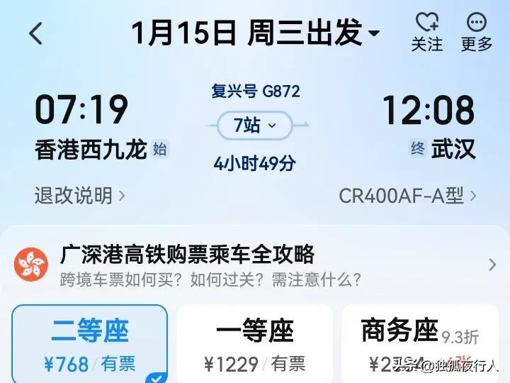 大家关心的车票价格,我也对比了香港西九龙至武汉站的其他高铁情况,只有由北京铁路局担当的G306次高铁的二等座跟一等座价格,比其他几趟由广铁集团担当的稍微便宜个大几十块钱,商务座价格,都是一样的。全程二等座768、一等座1229、商务座2384。