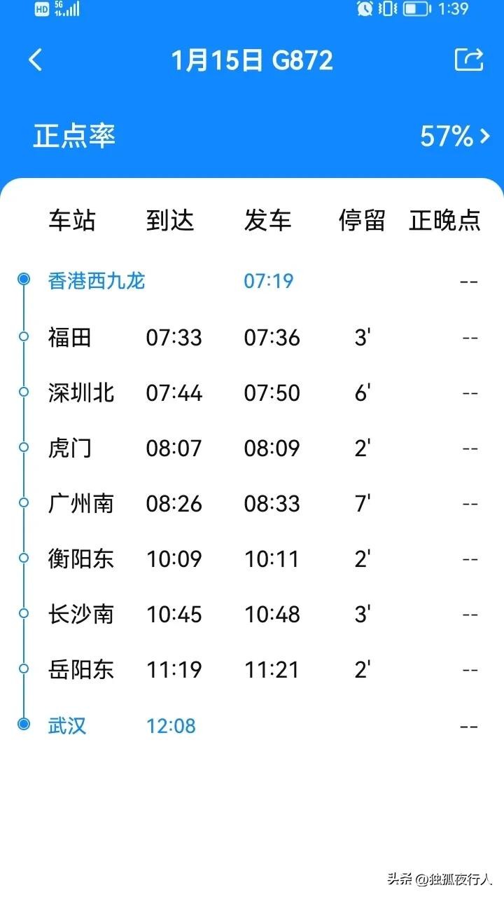 G872次高铁,从2025年1月5号开始,每天早上7:19分从香港西九龙站始发,后面依次停靠福田站7:33、深圳北站7:44、虎门站8:07、广州南站8:26、衡阳东站10:09、长沙南站10:48、岳阳东站11:19、中午12:08终到武汉站。
