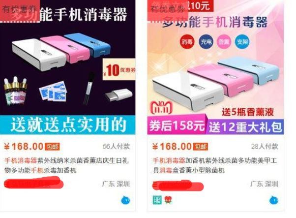 大部分摊位上贩卖的其实是淘宝销售的一种手机消毒器,并无吹嘘的效果。
