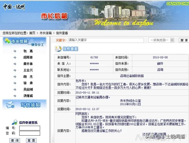 另外,与之对应的是:2015年2月17日,在广安市政府官网/广安资讯中查到,邻水县也积极对上汇报衔接、做好达渝城际铁路建设前期工作。