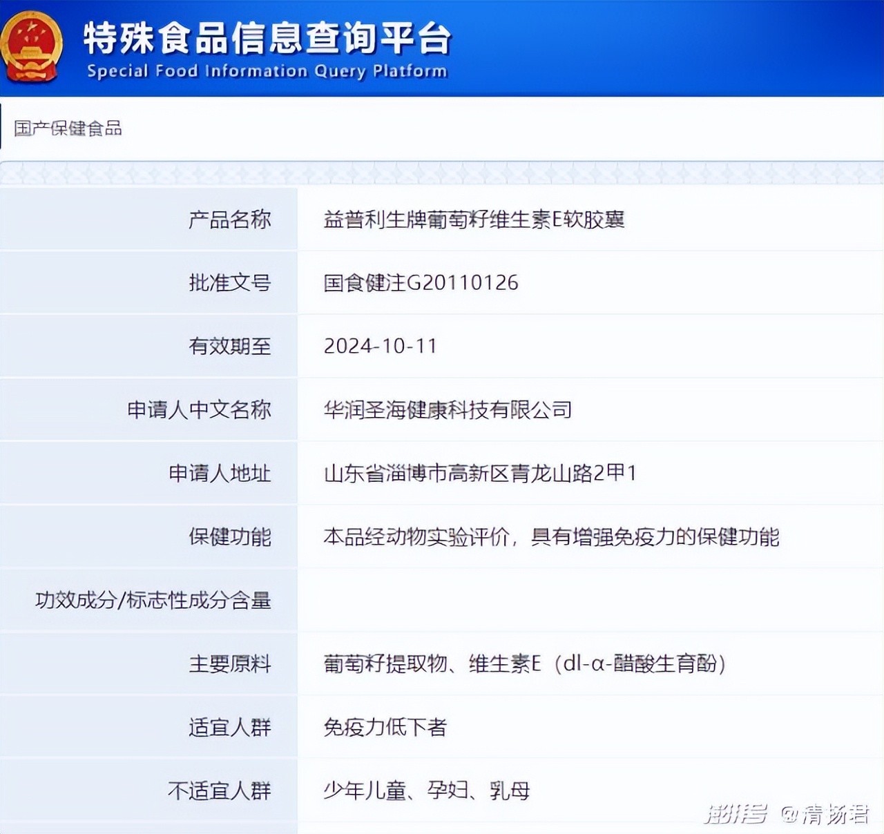 通过特殊食品信息查询平台,清扬君发现“国食健字G20110126”对应的产品为“益普利生牌葡萄籽维生素E软胶囊”。这是华润圣海健康科技有限公司的一款产品,备案说明是“经动物实验评价,具有增强免疫力的保健功能”,适宜人群为“免疫力低下者”,不适宜人群为“少年儿童、孕妇、乳母”。