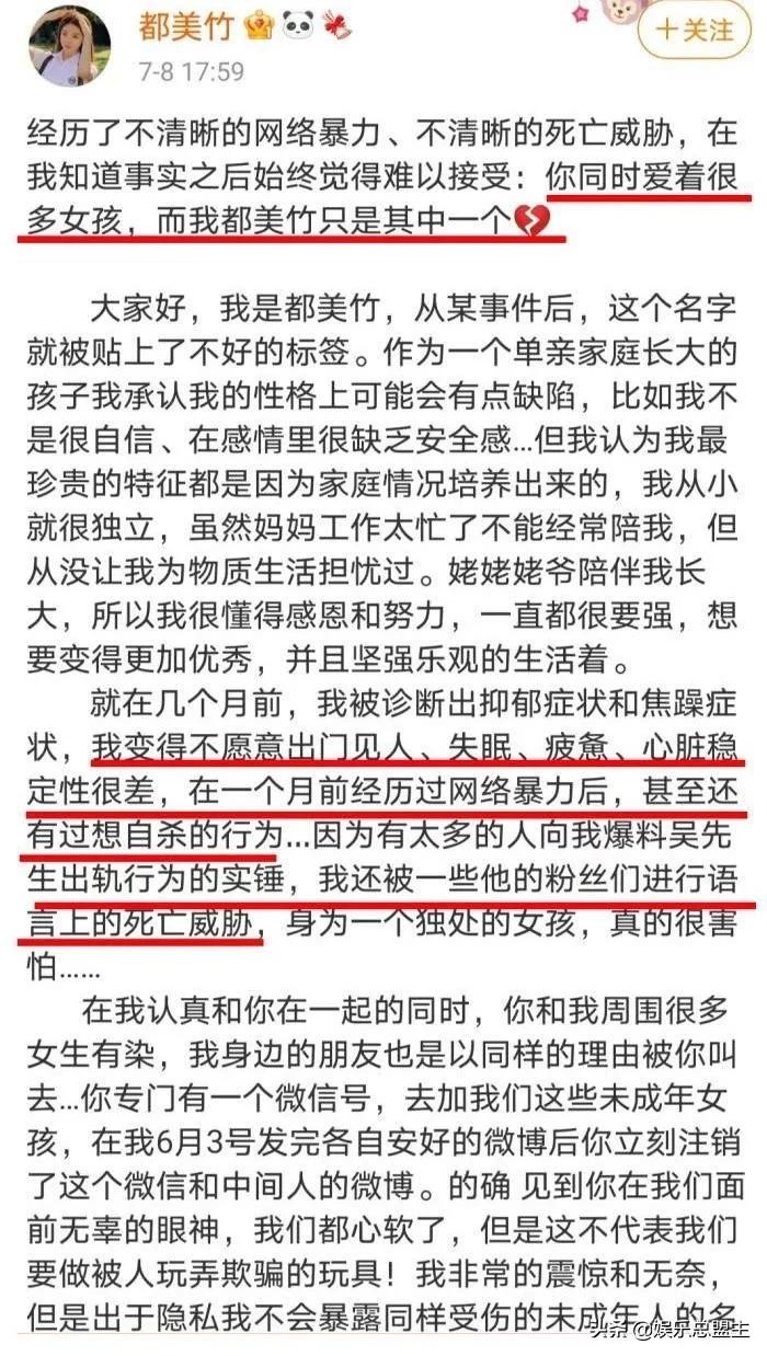 让我们回顾一下事情的经过,今年6月份一位名为都美竹的博主在网上爆料称吴亦凡在和自己交往期间玩弄感情,是一个渣男,导致自己失眠,抑郁。发文的同时还配有多张张片,事情一看妥妥的实锤,本来一位吴亦凡现身发文道歉事情也就结束了,但是我们的吴先生也是一个耿直男孩,出现这件事后并没有道歉,而是发出一张律师函,声称对这件事情表示震惊,并且保留追究当事人法律责任的权利。