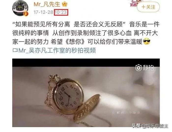 吴亦凡不仅在节目和赵丽颖撒娇,还在节目外邀请赵丽颖担任自己新歌《想你》MV的女主角,而自己更是将首发时间定为10:23这其中的含义大家肯定都不陌生。