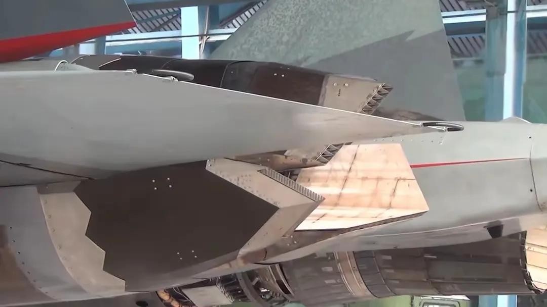 然而,事实上,受后机身设计限制,苏-57左右两个三元推力矢量喷管只能分别从左上至右下、右上至左下偏转,并未达成提升滚转性能的预期效果。三元推力矢量喷管反而带来增重较大、雷达和红外隐身效果不佳等问题。因此推测,在综合考量这些因素之后,苏霍伊设计局将“052”号苏-57原型机的左发动机换装了二元流体推力矢量喷管。