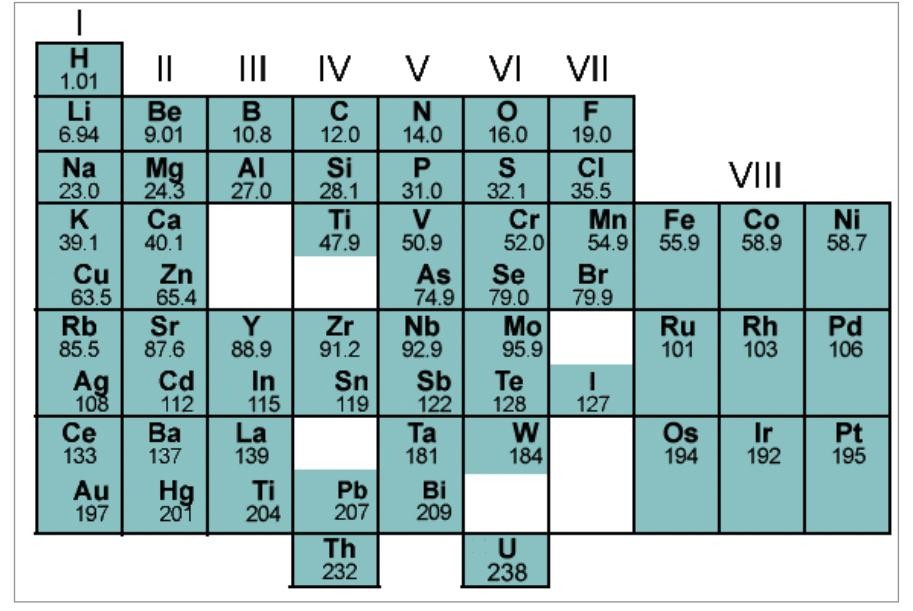 德国化学家迈耶尔Meier与门捷列夫几乎同时各自发明了自己的周期表,并且都是按照原子量进行排列的。只是迈耶尔仅包含28种元素,其他元素在其周期表上并不适用。1869年2月19日,门捷列夫排出了一个周期性的元素表,不只是列出了63种当时已知的化学元素,同时还指出世界上还有未被发现的元素,并表明它们在元素周期表中的位置,以及其基本参数。例如在锌和砷之间有两个空格,门捷列夫就预言出这两个未知元素的性质分别具有类铝和类硅的性质。