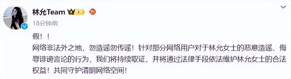 林允强调网络不是法外之地,希望谣言制造者停止捏造和传播不实信息。