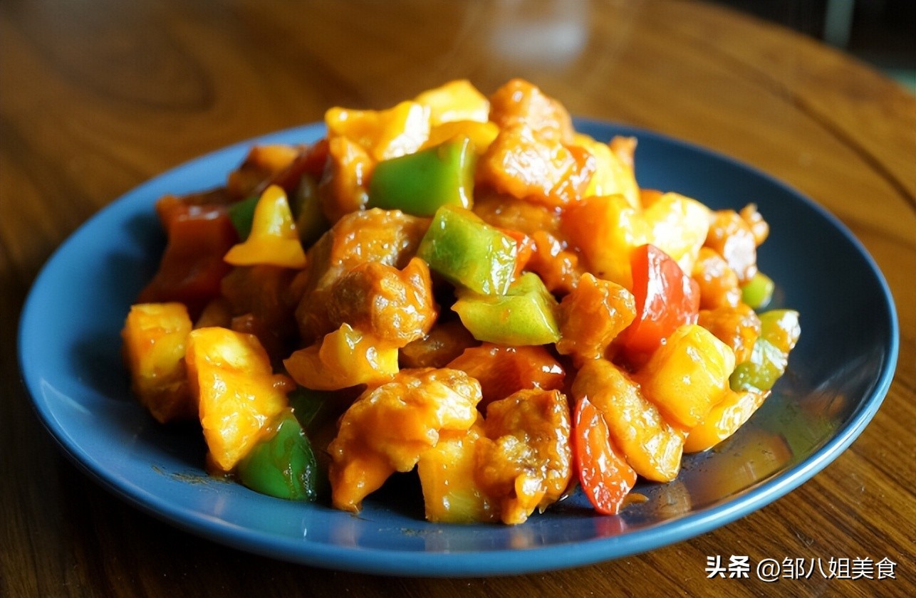 锅内留底油,放入番茄酱、白糖、清水翻炒到浓稠的状态,将肉块放进去翻炒均匀,再倒入菠萝、彩椒快手翻炒片刻,就可以出锅了。