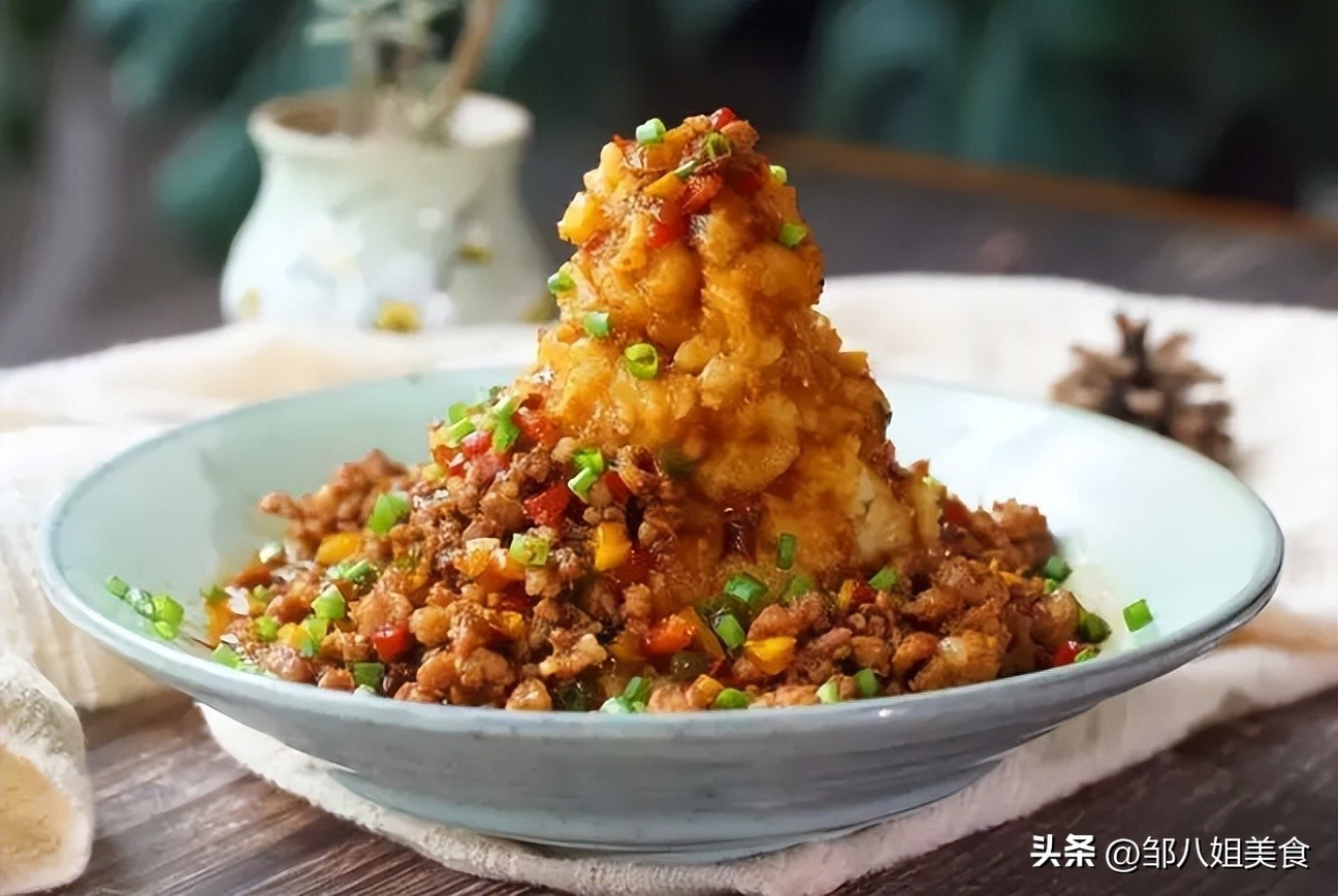 最后将肉末浇在土豆泥上,就可以端上桌食用了。这道菜好看又好吃,老少皆宜,别错过了。