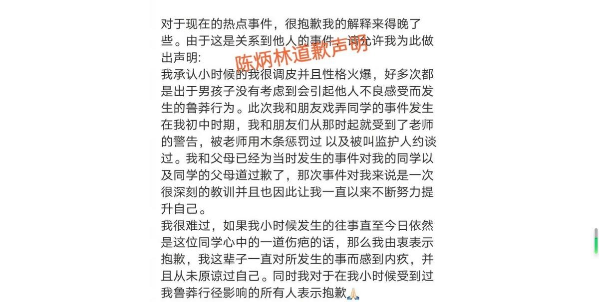 当初由于《黑暗荣耀》的火热,一些普通人也勇敢向公众发声曾经在自己身上发生的霸凌事件,泰国的一位也发推暗指gmm家的一位男星,然后网友们根据线索推断是陈炳林,而后续陈炳林发文道歉、公司关于因陈炳林霸凌解约事件发布了公关文