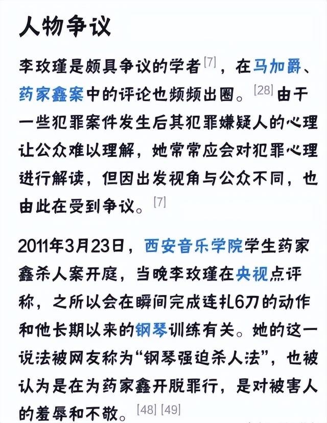 李玫瑾曾经分析过药家鑫杀人时的心理状况,认为他连续扎6刀的行为和他常年钢琴训练有关,她的说法被网友嘲讽为“钢琴强迫杀人法”,觉得她在为恶人开脱。