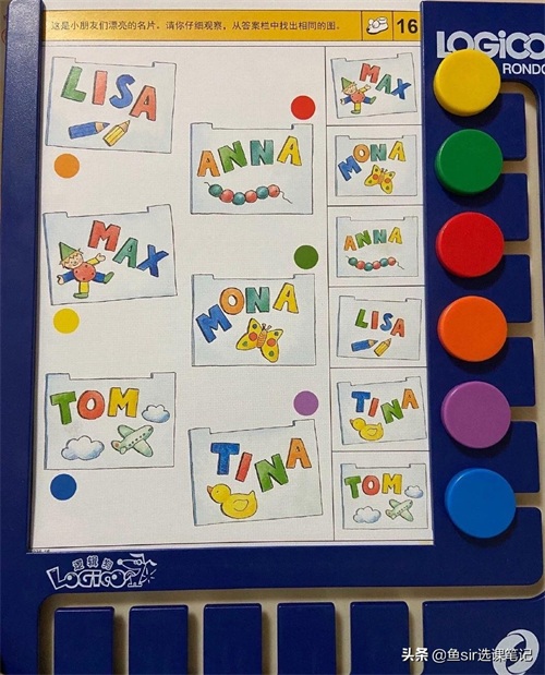 例如上图中的题目。它需要孩子先找到各个颜色的圆点指代什么,然后根据右侧列表当中的图片,将对应颜色实物圆钮拨动到正确位置。