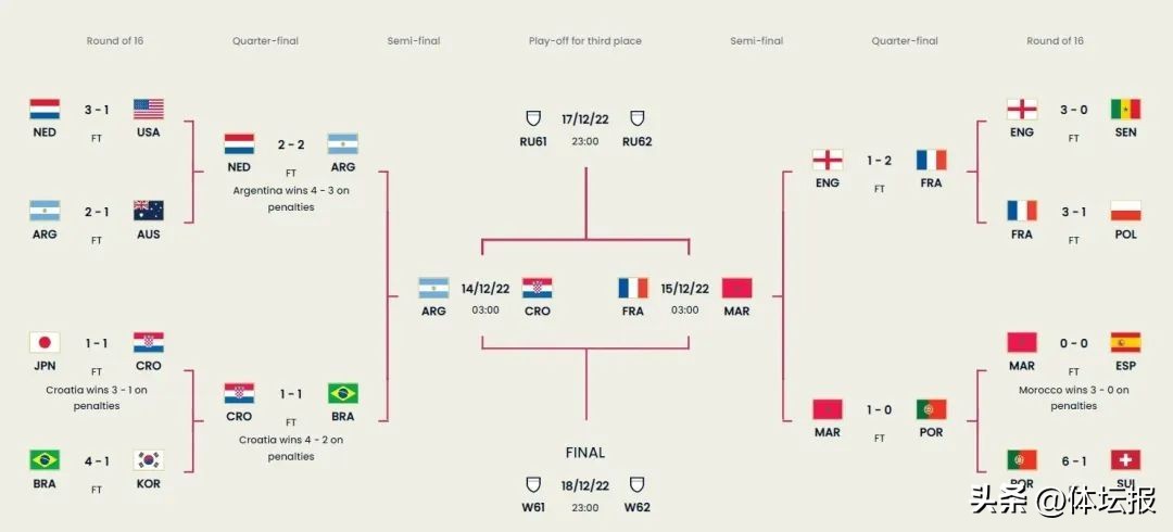 接下来的两场半决赛时间分别为12月14日凌晨3:00阿根廷vs克罗地亚,12月15日凌晨3:00法国vs摩洛哥。