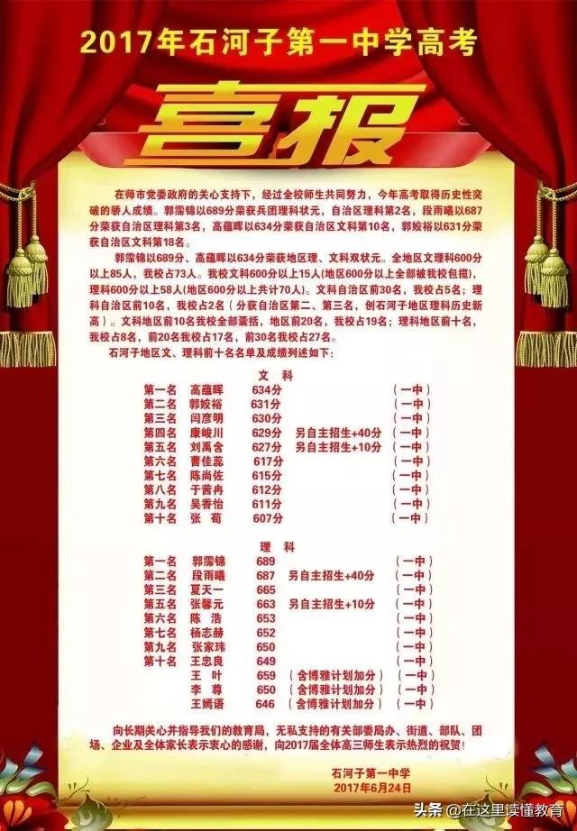 2016年,注定是不平凡的一年,石河子第一中学高考捷报频传。周雨飞以659分摘得新疆自治区文科状元桂冠,罗婉莹以638分荣获自治区文科第10名,库迪热提以631分荣获自治区文科第11名。陶伟杰以695分荣获自治区理科第7名, 李东峰以688分荣获自治区理科第18名,石河子第一中学理科680分以上人数,雄踞自治区第二名。