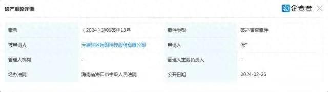 就在最近有人发现企查查上多了一条新的破产审查案件。仔细一看,原来是已经消失很久的天涯社区。