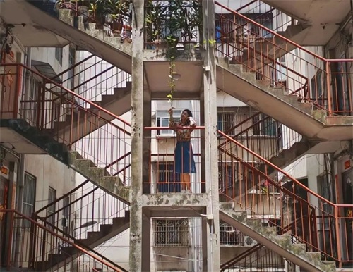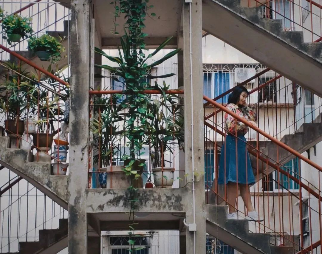 “鸳鸯楼”,始建于1987年,至今已有三十多年的历史,两座建筑之间通过相互交错的双向楼梯把彼此连接,左右完全对称,形似两只鸳鸯相对而立,故被称为“鸳鸯楼”。斑驳的水泥墙体,阡陌交错的电线,边缘坑洼的楼梯,锈迹斑斑的扶手,无一不透露着历史的沧桑感。结构别致,错落大方,在复古滤镜的加持下,就是天然的怀旧摄影棚,随手一拍都是大片,也让它成为了热门的打卡地点。