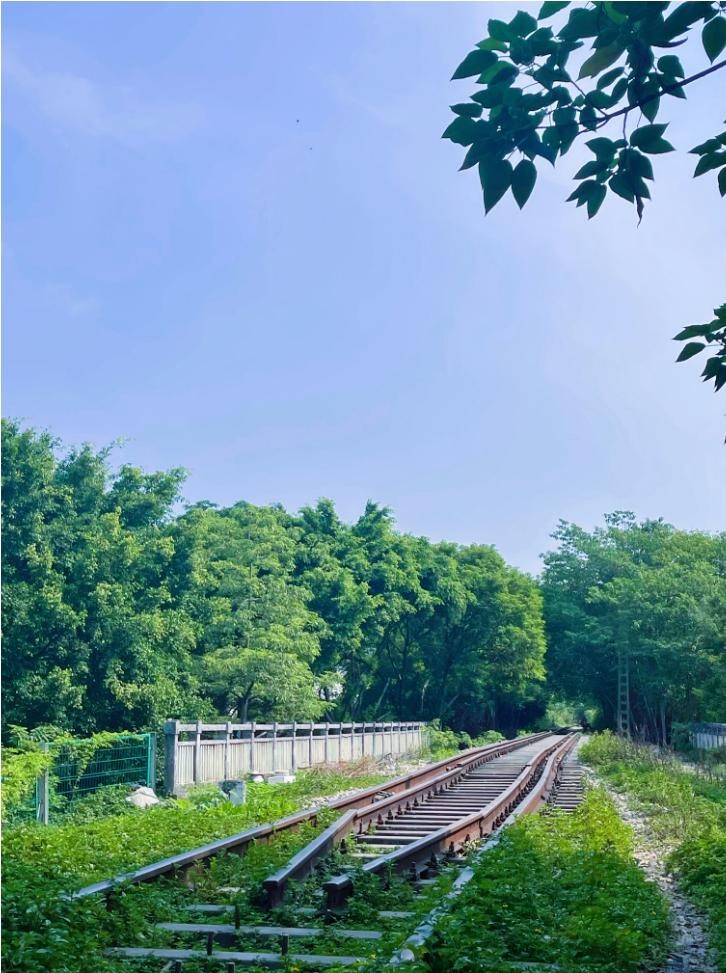 站在铁轨上往远处看去一眼望不到尽头。轨道两旁郁郁葱葱的树木树影婆娑,轻柔而悠扬的知了叫声,为这寂静的铁路增添了一丝生机。坐在这里,清风徐来,容易让人忘记夏天的燥热,心情会因为这治愈系的美景而变得美好起来。
