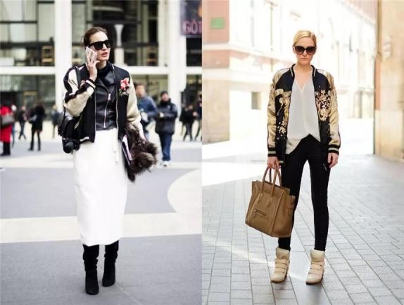 如龙、凤、花卉图腾,绣在了当下流行的缎面棒球夹克上,时髦度爆表,街拍达人们用美图来告诉你,这样的中国风才是正确的打开方式,人人都Hold得住。