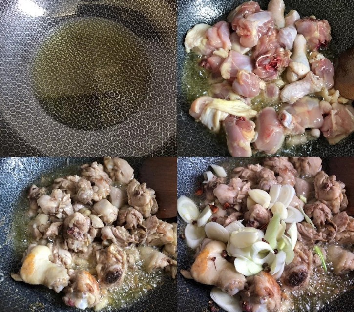 4.锅中加入适量的食用油烧热,放入鸡块中小火煎炒到表面焦黄;