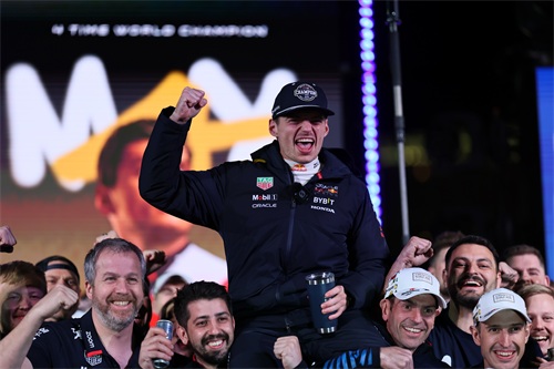 这是2024年11月24日,红牛车队荷兰车手维斯塔潘(上)在2024赛季F1拉斯维加斯大奖赛正赛后庆祝自己第四个F1世界冠军。