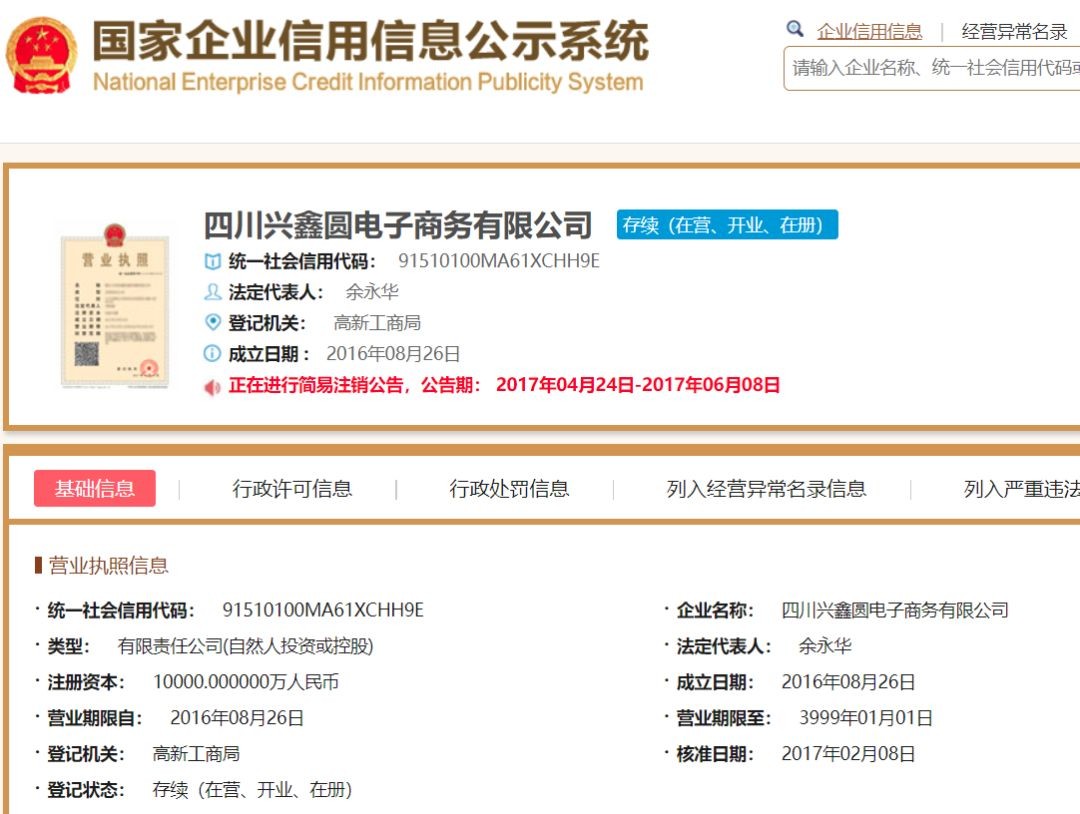 但仅成立数月后,2017年4月24日,两位股东便向成都市高新区工商行政管理局申请交易注销登记。二人出具承诺书,承诺兴鑫圆电子商务申请注销登记前未发生债权债务,不存在未结清清算费用以及未交清的应缴纳税款等。该注销公告期为2017年4月24日~2017年6月8日。