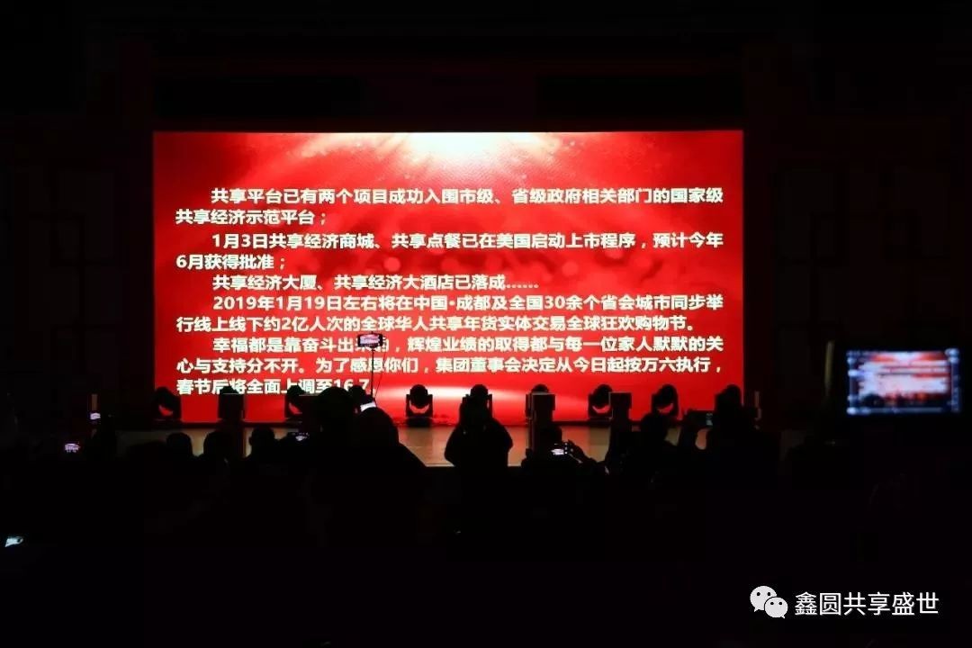 “年会现场宣布了多个惊喜,共享经济商城、共享点餐已于1月3日正式启动上市程序,预计今年6月获批。而备受关注的共享分红,即日起按万分之六执行,春节后,服务费将从11.7%全面上调至16.7%。”
