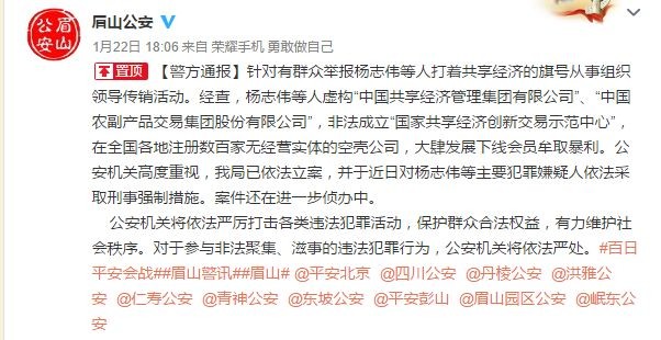 “针对有群众举报杨志伟等人打着共享经济的旗号从事组织领导传销活动。经查,杨志伟等人虚构‘中国共享经济管理集团有限公司’、‘中国农副产品交易集团股份有限公司’,非法成立‘国家共享经济创新交易示范中心’,在全国各地注册数百家无经营实体的空壳公司,大肆发展下线会员牟取暴利。”