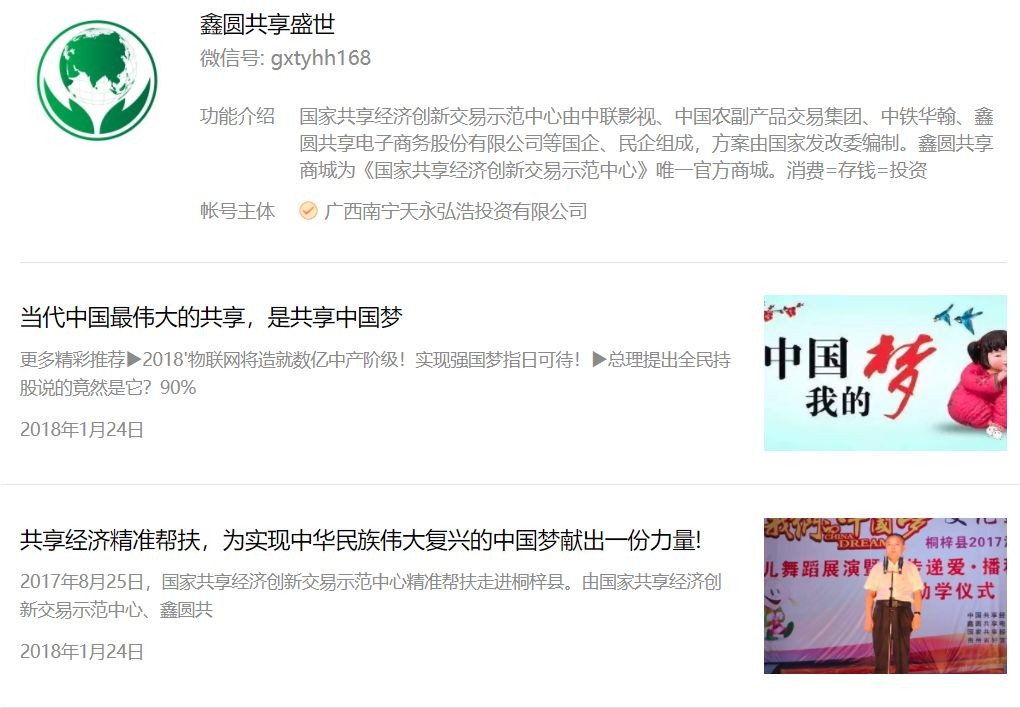 此外,记者注意到,在微信公众平台上,有一个账号主体为“广西南宁天永弘浩投资有限公司”,名叫“鑫圆共享盛世”的公众号,直至1月24日仍在更新关于鑫圆共享和杨志伟的动态。不过,仅通过天眼查查阅到的相关信息,暂未发现账号主体公司与鑫圆共享的关系。