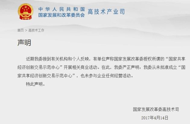 近期我委接到有关机构和个人反映,有单位声称国家发展改革委授权所谓的“国家共享经济创新交易示范中心”开展相关商业活动。在此,我委严正声明:我委从未批准成立“国家共享经济创新交易示范中心”,也未参与企业任何经营活动。