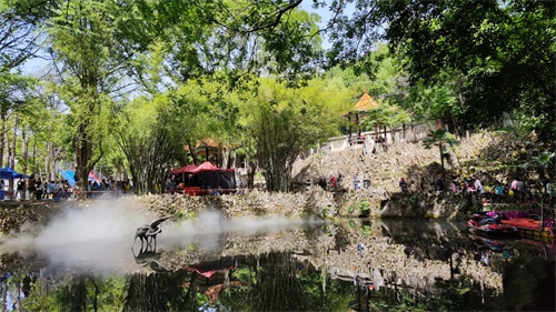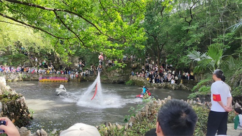 建议过去游玩自驾,位置偏远,穿过江夏老城区,街道较窄开车注意来往行人。也有很多骑行爱好者过去八分山顺路来游玩白云洞的。今天正好是周末过来的人还是比较多,天气也是阳光明媚。门票现在是30一个人,景区安排了很多表演节目,平时也有节目观看,就是需要等到时间点,周末是下午3点半水上飞人表演(水上摩托喷水,将表演人员喷起,夏天水上乐园很多,也是第一次近距离观看,技术难度还是很大的,空中旋转,空翻),结束后还有杂技人员表演孙悟空杂耍等。