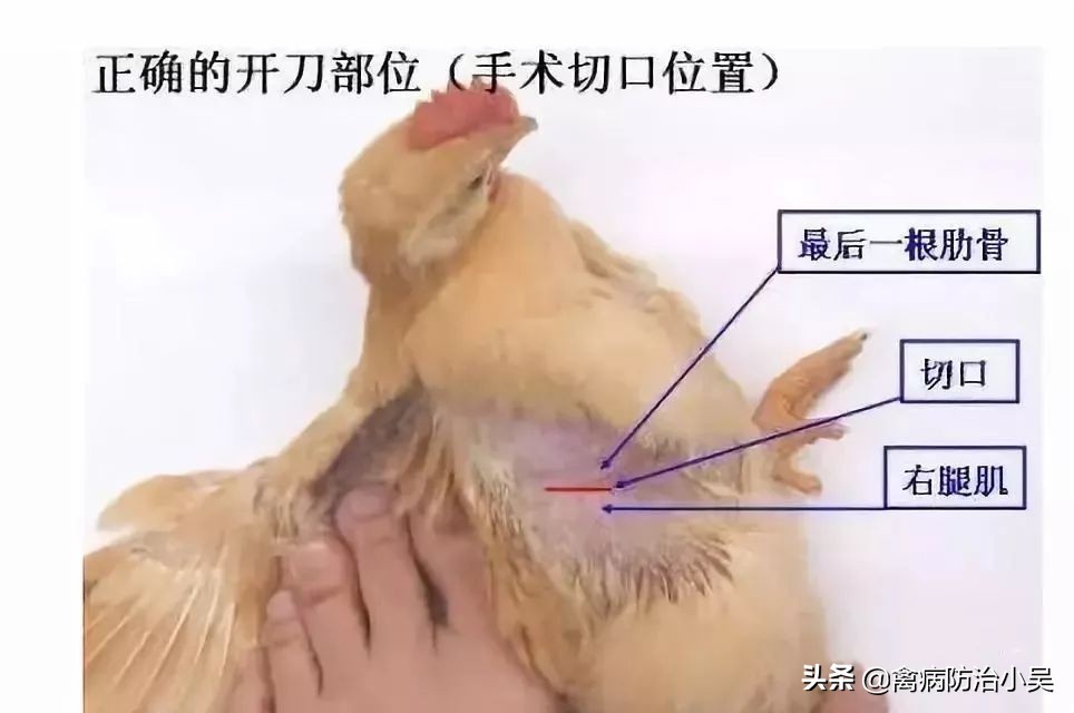 左手拇指按住鸡的尾根部向前推动使躯体前移,保持鸡只的两腿相对地伸直,用食指确定切口位置在肋骨的椎骨部与胸骨部交界的上缘(第六肋间隙或最后肋骨后缘),并固定切口部位的皮肤使其自然错位,这样术后皮肤可自然覆盖切口。