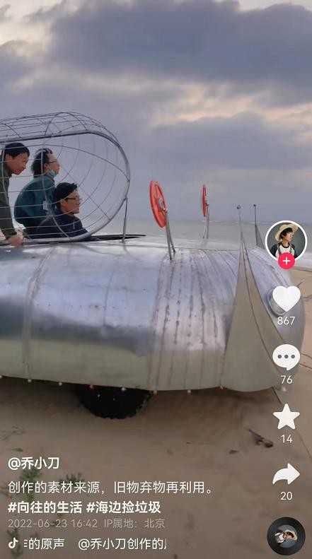 而乔小刀源源不断的创意也并没有止步,他在各大平台发布自己的创意作品,某音上,乔小刀才发布了在海滩边捡废弃物造成了一部小车,许多人们眼中的废品在他的手中都成了艺术品。