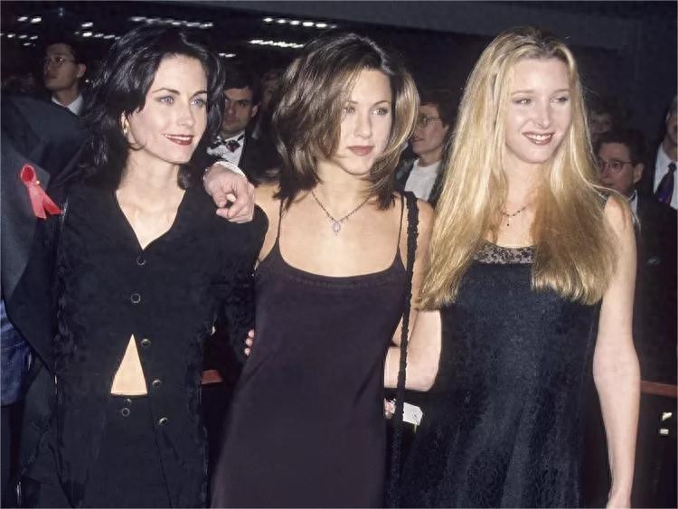 30、1995年,身穿黑色吊带裙的安妮斯顿,与考特尼·考克斯和丽莎·库卓在GLAAD媒体奖颁奖礼上合影。她穿着一件拖地的深棕色吊带裙,搭配尖头鞋、90年代的棕色唇彩和一条带吊坠的精致项链。