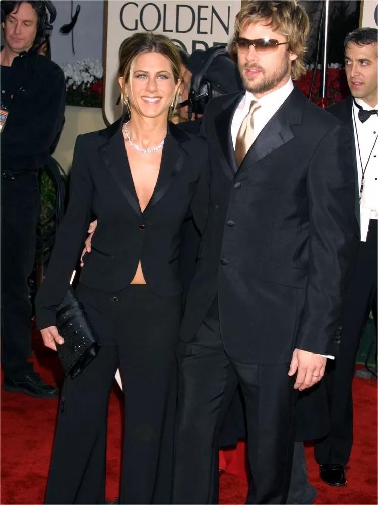 22、安妮斯顿身穿黑色西装外套、长裤、同色系手包和闪亮的珠宝出席2002年金球奖颁奖典礼。这是一件燕尾服外套,真空上阵,搭配了阔腿拖地长裤,把头发梳成随意的高髻,配上一个细长的黑色串珠手包、尖头高跟鞋和闪闪发光的珠宝。