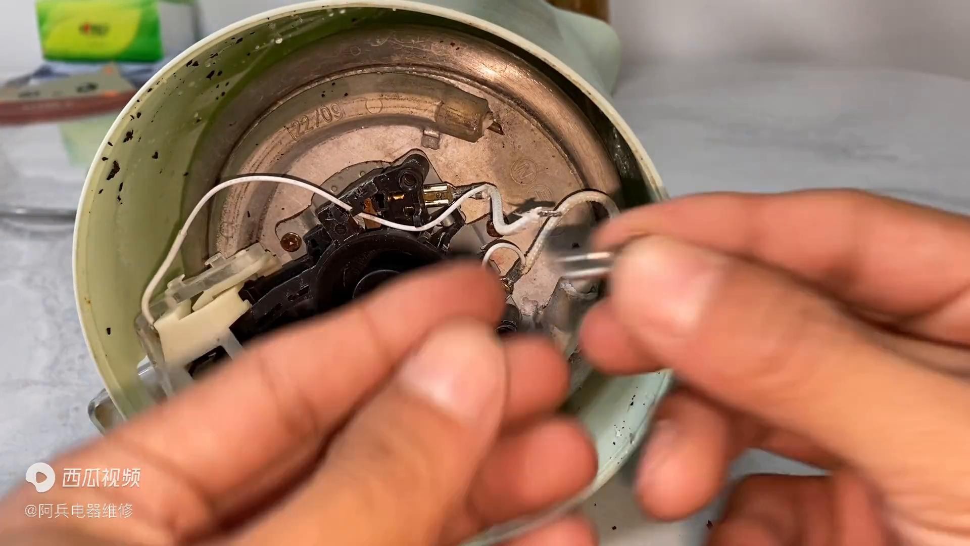 ·首先我们来看一下第一个原因,也就是说是这个底座连接到这个加热盘的线断掉了引起的。当这边断掉了,它电就不能给加热盘加热,但是这个线指示灯的线没有断,它可以正常亮,所以说我们碰一下动一下,你们看很明显这边断掉了,但是这边还是可以的,那说明就是这个加热盘的线断掉了。