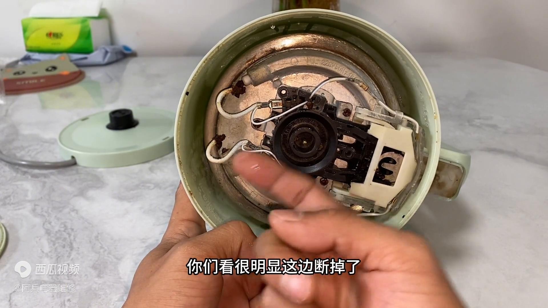 ·比如我们加点水,已经听到声音了,看到吧,可以了,那这个电水壶灯亮不加热的问题也就解决了。就这么简单。